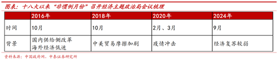 ①时间超预期:9月召开经济主题的政治局会议为十八大以来首次。按照惯例,每年的4月、7月、12月的政治局会议通常涉及经济议题,分别对一季度、上半年和全年经济工作进行总结。十八大以来,仅有4次非惯例月份召开的经济主题政治局会议,分别对应2016年的供给侧改革、2018年的中美贸易摩擦、2020年的疫情冲击和本次经济复苏较弱,其中,9月召开经济主题的政治局会议为十八大以来首次。