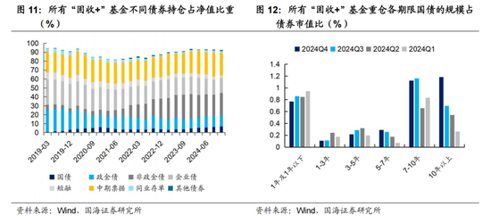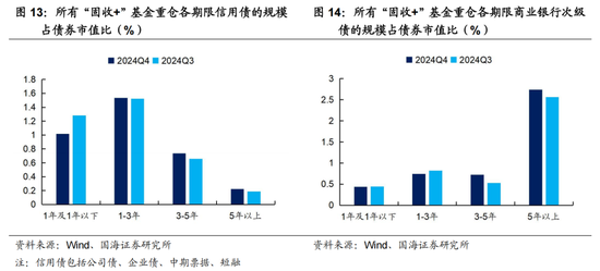(2)从券种角度看,四季度“固收+”基金的利率债仓位,尤其是超长端配置比例继续提升。2024年四季度末,国债仓位较三季度增加0.32个百分点至6.81%。而从重仓券的期限来看(图12),10Y以上品种的持仓比例较三季度大幅增加。