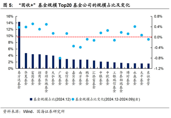 从基金管理公司来看,富国基金、景顺长城、华夏基金等机构的在管规模占比明显增加。截至2024年12月31日,易方达管理的“固收+”基金规模为1856.2亿元,占全部“固收+”基金市场规模的比重为14.3%,较9月底增加0.38个百分点。而富国基金、景顺长城、华夏基金等机构所管“固收+”基金规模占比则有明显增加,相较于三季度末,占市场规模的比重分别抬升了0.51、0.49、0.39个百分点。