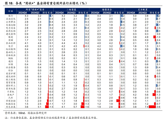从“固收+”基金重仓股所在行业的持仓比重变化来看,银行、石油石化、公用事业等高股息板块是其关注的焦点,重仓比例持续增加。对有色、机械等顺周期板块则有明显减持。