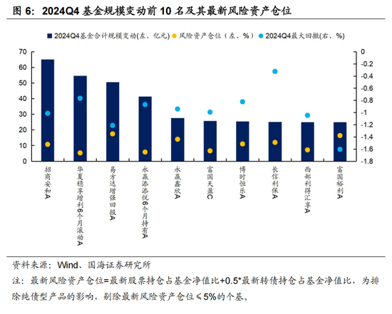 从单个基金角度来看,规模增长较多的产品,风险仓位普遍偏低,风险控制能力较强。2024年四季度,基金规模变动排名Top10的“固收+”基金中,其风险资产仓位普遍低于15%,也因此,得以在股市大幅震荡的行情中,保持了相对较低的净值波动,各产品的最大回撤普遍优于行业中位数(-1.2%)。这也表明,投资者对“固收+”基金的定位仍然偏向稳健,尤其是在股市波动较大的行情中。