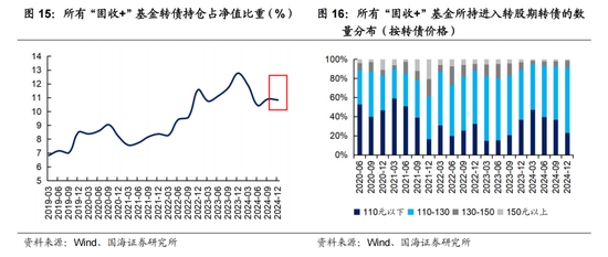 而统计2024年四季度末,所有“固收+”基金所持有的110元以下、110-130元、130-150元、150元以上进入转股期的转债数量,可以看出,110-130元、130元-150元的标的占比有所增加,这一方面与转债市场走强,所持转债价格普遍上涨有关。另一方面也表明,在四季度,“固收+”基金适当增加了具有一定进攻性的品种。