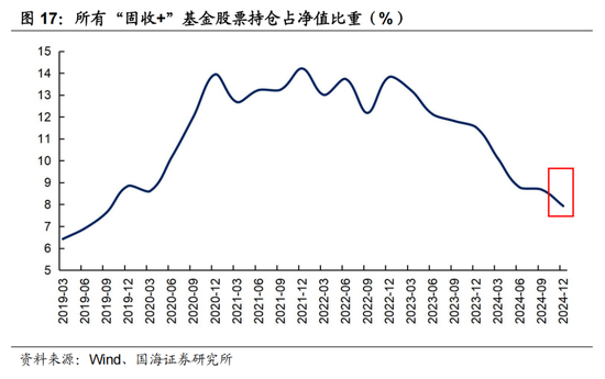 在股票方面,“固收+”基金的股票仓位仍在回落。四季度的股市持续震荡,出于避险目的,“固收+”基金的股票仓位仍维持在相对较低的位置。截至2024年12月31日,“固收+”基金的股票持仓比例为7.93%,较9月底减少0.75个百分点。