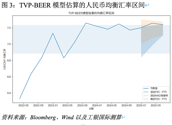 根据TVP-BEER模型测算,当前人民币对美元的均衡汇率区间位于6.9~7.2。截至8月22日,USD/CNY报约7.17,基本处于区间中枢。这意味着人民币既未出现系统性高估,也未被显著低估。这表明人民币内在机制稳定,能够在复杂的国际环境与多重外部冲击中维持合理均衡,反映出经济基本面与市场预期的良性互动。