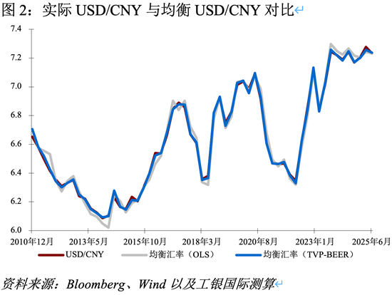 对于双边汇率USD/CNY,走势同样呈现阶段性波动,整体与BEER模型推导的均衡水平保持一致。2011~2014年间,人民币持续升值,USD/CNY从6.6左右降至最低6.1附近;2015年“8·11汇改”后,汇率迅速从6.3左右升至6.6~6.8区间,与均衡值同步上移;2018~2019年贸易摩擦期间,人民币再度承压至6.9~7.0;2020年疫情冲击下,人民币先贬后升,反映出外部冲击与资本流动对均衡水平的影响;2022年美联储大幅加息推动美元走强,USD/CNY上行至7.2~7.3区间。