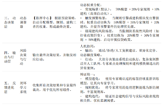 这是将专家因果和社会建构“嵌入”模型流程的关键层,分为自动化、半自动化和人工干预三条路径。自动化规则引擎(社会建构与专家因果的固化)、社会建构规则(强制性)、专家因果规则(逻辑性)输出:对模型初步决策给出通过、拒绝、强烈建议复议的指令。人机协同决策区(动态调谐体现):“灰区”案例自动捕获:系统自动捕获模型评分在“复议区间”的申请,或模型结果与规则引擎结果出现冲突的案例。专家控制台:这些案例被推送至人类专家控制台。控制台界面不仅显示模型分数,更关键的是呈现:模型决策原因(关键贡献特征)。