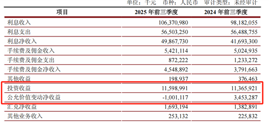 非利息收入方面出现较大波动,其中公允价值变动净收益为-10.01亿元,同比下降128.99%,三季报中给出的原因是——交易性金融资产公允价值变动影响。