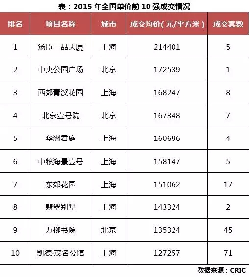 实际上,全国卖得最贵的房子对整体成交均价影响不大。拿去年全年成交均价前10强来说,其中,卖得最贵的是汤臣一品,成交均价超21万,售出5套。第二名是北京的中央公园广场,均价17万多,只卖了一套。前8名加在一起总共卖了49套,称得上凤毛麟角。第9名和第10名总共成交116套,对市场具有一定的影响。但这两个项目均价只是在13万上下,因而媒体言过其实,中国根本不是他们所说的房价远超海外大都市的状况。