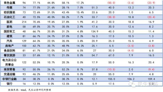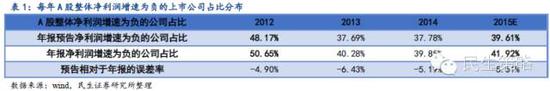 2015年A股整体净利润增速负增长的上市公司占比较前年增加1.1%至41.9%。在已披露年报预告的公司中,39.6%的上市公司拥有负的净利润增速,2014年该比值为39.2%。考虑到近年预告净利润增速负增长的公司占比较年报略有低估,过去三年平均误差率为-5.51%,调整得到2015年A股整体净利润增速负增长的上市公司占比约为41.92%。