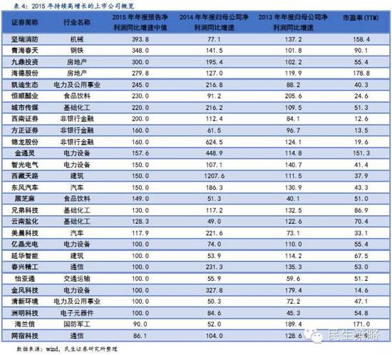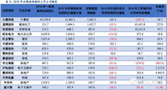 关注年报业绩超预期和高增长的投资标的。A股市场在经历2015年的大起大落后,单纯讲故事的投资逻辑越发站不住脚跟,市场开始重视基本面改善带来的投资机会。为此我们梳理了2015年年报业绩超预期和高增长的标的,超预期筛选标准为2015年年报预告净利润增速中值超过wind一致预期50%以上,高增长筛选标准为2015年年报预告净利润增速中值超过80%,2014和2013年年报归母公司净利润同比增速均超40%。整理如下: