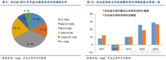 创业板2015年净利润增速约为28.6%,相比2014年的24.01%小幅上扬,剔除净利润最大的四大公司后净利润增速约为15.5%。2014年创业板净利润增速为为24.01%,2015年前三季度创业板净利润增速为25.13%,年报快报显示创业板年报业绩预告的净利润增速中值达到26.5%。业绩预告中67.7%的上市公司拥有正的净利润同比增速,远超过中小板和主板,创业板上市公司的成长能力更优异。创业板年报快报披露率超90%,统计已披露2015年年报快报的公司净利润亏损比例为9.5%,归母公司净利润增速达26.4%,过去三年快报相对年报的误差率为-7.8%,调整后得到创业板2015年整体净利增速约为28.6%。总体上,创业板上市公司净利润集中度较高,剔除净利润最高的四大公司(温氏股份、东方财富、蓝思科技和碧水源归属母公司的净利润占创业板的19.9%)后,创业板的净利润增约为15.5%。