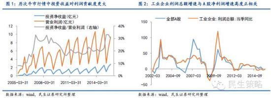 但2015年A股迎来七年不遇的牛市行情,历次牛市行情下上市公司投资收益对净利润的贡献更大,2015年A股投资收益占净利润的比重将高于2014年,这将部分抵消实体经济不景气对净利润的冲击。