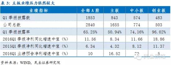 从一季报披露的情况来看,截止4月27日数据,两市共有1853家上市公司发布2016年一季度业绩预告,数量占比65%,其中基本上所有创业板公司已经公布,企业数占比超96%,代表性较强,主板和中小板已公布业绩预告的企业数量均过半。