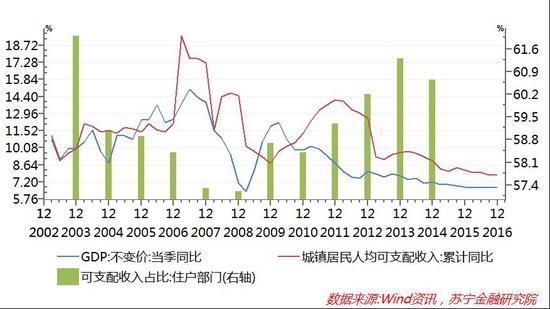 首先,城乡居民的收入长期高于GDP增速。居民消费升级和消费支出的持续增长,首要条件无疑是居民可支配收入保持不低于整体经济的增速。从实际变化趋势看,自2010年以来,城镇居民人均可支配收入增速,始终显著高于GDP增速,而住户部门在国民收入分配中的比重,自2012年后连续三年保持在60%以上(参见下图)。随着降低社保缴费等政策的继续推行,预计这一趋势还将得以延续。