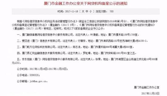 11月16日,厦门市金融办发布《关于网贷机构备案公示的通知》,对5家拟备案企业予以公示,公示时间为11月16日至11月25日。5家拟备案的企业对应的平台分别是农金宝互金、日日进、乾方位、易利贷和京东旭航(京东金融旗下新建的子公司)。