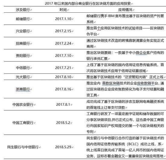 区块链技术由于拥有去中心化的分布式结构,高度透明、开放的系统,数据的保密性和不可篡改性等特点,目前在金融行业,特别是银行业的应用呈现出较高的积极性。银行本质上作为资金的安全仓库和传输枢纽,与区块链作为一个数字化、放篡改的分类账具有类型的功能。事实上瑞士银行、巴克莱银行等一些国外银行早已开始了区块链技术的应用实践,并取得了初步的成效。我国各大银行从2017年以来也都纷纷大胆尝试将区块链技术和自身的业务相结合,探索适合中国金融业发展的区块链应用模式。