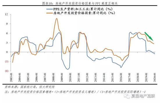 房地产投资的价格因素与PPI高度正相关,特别是加工工业出厂价格。2019年,房地产开发投资价格因素同比增长2.6%,较1季度回落0.9个百分点,主要受PPI见顶后持续回落影响,同期,PPI累计增速回落0.5个百分点、加工工业PPI回落0.6个百分点。