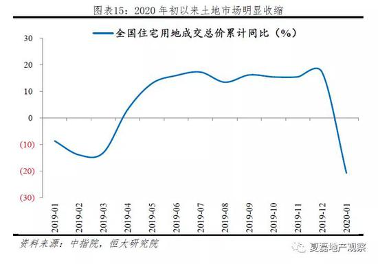 展望未来,由于2019年拿地增速较2018年大幅回落,同时疫情对今年一季度土地成交的冲击也将影响下半年开工,决定了2020年投资总体将进一步下行。2019年全国住宅用地成交规划建筑面积20亿平、同比微增0.6%,2020年1月同比大降37.9%,而2018年全年为增长26.3%,2018年下半年为增长10.4%。考虑到土地成交领先房地产投资9-12个月,2020年的房地产投资将明显受到拿地减少的滞后影响。