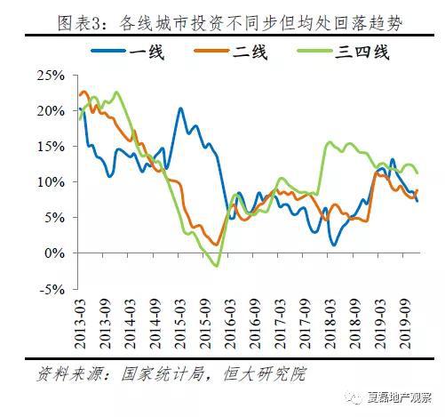 分城市能级看,由于2018年下半年至2019年一季度各线城市土地市场热度均回落,因此当前各线投资也是下行趋势。一线、二线、三四线城市的投资额占全国的比重,大致为1:4:5的结构,2014-2019年,一线城市平均占比11%、二线城市38%、三四线城市51%。拿地对投资的领先期,一线城市约12-15个月,二线城市约9-12个月,三四线城市约9-12个月。从住宅用地成交规划建筑面积累计增速看,2018年中至2019年初,各线拿地增速均显著回落,由于12个月左右的滞后期,各线城市的房地产开发投资增速在年中以来均为回落趋势。2019年,一线投资累计增速在6月达到13.2%的阶段性高点后持续回落,全年为7.3%;二线城市在2月达到11.2%的阶段性高点后总体回落,全年为8.9%;三四线城市年内在3月达到12.6%的阶段性高点后有所回落,全年为11.2%。