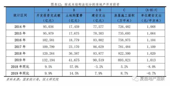 从成本结构来看,当前的投资趋势,主要是土地支出增速持续回落,建安支出提速不能完全支撑。2019年,土地购置费同比增长14.5%,较1-4月回落15.2个百分点;剔除土地购置费后的建安支出同比增长7.9%,较1-4月加快2.4个百分点,其中房屋施工面积增速放缓0.1个百分点至8.7%、单位建安支出则从-3.0%收窄至-0.7%。