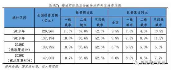 分城市能级预测看,若不做应对,预计2020年一线城市投资增速6.8%、较2019年回落0.5个百分点,占比10.9%、较2019年上升0.1个百分点;二线城市增速5.8%、回落3.1个百分点,占比36.6%、与2019年持平;三四线城市增速5.5%、回落5.7个百分点,占比52.5%、下降0.1个百分点。其中一线城市投资增速回落相对较小,主要由于2019年拿地略有回升;三四线城市投资增速降幅较大,主要由于2019年拿地已现负增长。