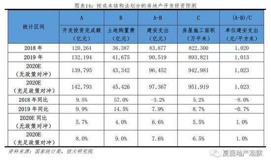若不做应对,预计2020年土地购置费增速4%、较2019年回落10.5个百分点;建安支出增速6.6%、回落1.3个百分点,其中,房屋施工面积增速5.5%、回落3.2个百分点,单位建安支出增速1%、由降转升。