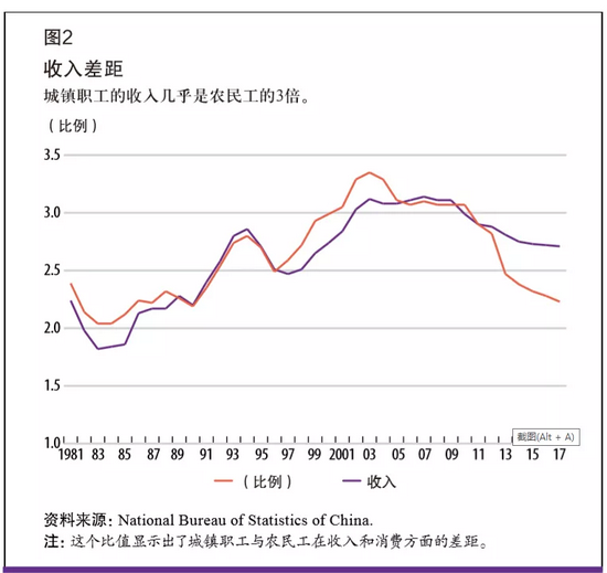 中国的城市户籍限制政策正在逐步取消,尤其是在一些二、三线小城市。如江西省取消了户籍限制,但在广州和上海等中国最发达的经济中心地区,户籍限制政策依然很严格。虽然中国存在大规模的人口流动,但城乡收入比仍在稳步上升。到2007年,城镇职工的人均收入已达到农村地区的3.14倍——这使中国成为了全世界城乡差距最大的国家(见图2)。中国人口大约占全世界人口总量的五分之一,但却只有7%的可耕种土地,因此,想要5亿人口摆脱农村经济、过上小康生活,困难重重。不过,即便算上已经迁入城市的农民,相对于中国的人均收入和人口密度来说,中国的城市化率仍然很低。韩国等经济快速增长的亚洲经济体在这个发展阶段的城市化率已经接近80%。令人欣慰的是,在过去的十年里中国的贫富差距有所缩小——不过这种差距还很大,城镇职工收入是农民收入的2.71倍。