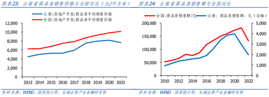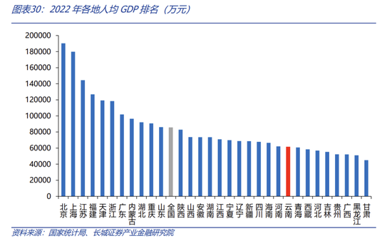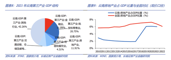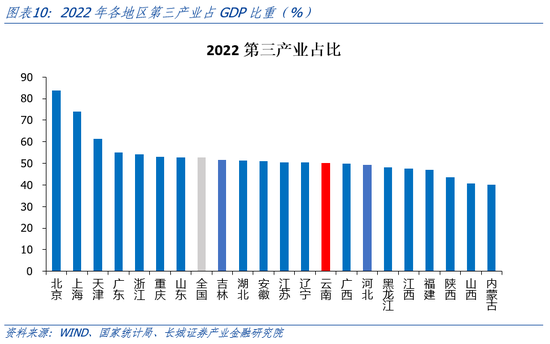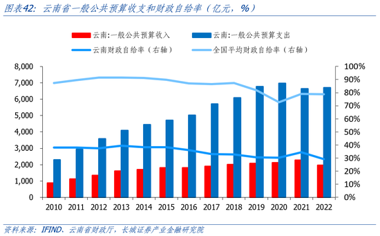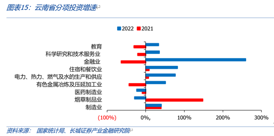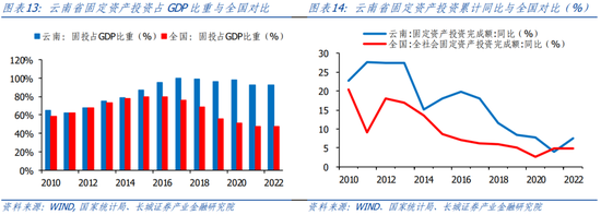 云南省固定投资完成额占GDP比重持续高于全国。我们用全国和云南不含农户的固定资产投资完成额作为衡量标准。从国家统计局公布的数据显示,云南固投从2010年的0.51万亿元增加到2022年的2.69万亿元,年平均增速14.97%,高于全国的7.46%。近十年,固投占GDP比重平均在85%,远高于全国的65%,且在2017年达到峰值(99.94%)。据2022年云南省国民经济和社会发展统计公报,固定资产投资增速最快的是金融业,为258.8%,制造业/住宿餐饮业/有色金属金属冶炼及压延加工业同比增速分别为40.3%/82%/50.9%,烟草制品业和医药制造业同比下滑28.7%和23.5%,但增速都相对较高。根据云南地方金融管理局今年3月发布的公告提到,旅游固定资产投资完成1053.2亿元,增速居全国第一。