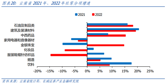从消费结构的增速上来看,建筑及装潢制品为主要消费项。根据统计局的数据来看, 2022年各类消费品中,除服装鞋帽纺织品类和家用电器和音响器材类增速下降14.5%和3.6%,云南大部份商品都保持一定程度的增速,粮食及食品/金银珠宝/中西药类/石油及制品类/建筑及装潢类等保持正增速,增速分别为5.5%/14.6%/15.3%/18.2%/19.3%。值得一提的是,2022年全年限额以上单位通过公共网络实现的商品零售额121.22亿元,比上年增长28.2%,电商发展迅速。