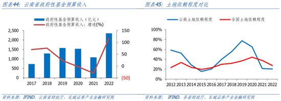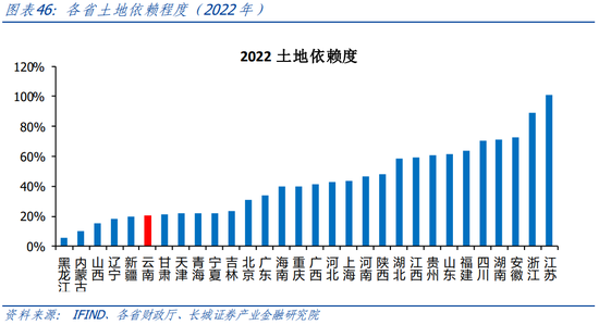 云南省财政对土地的依赖程度处于相对较低水平。我们以成交土地出让金占地方公共财政收入的比例来近似衡量土地依赖程度,2022年云南省的土地依赖度居全国各省市末游水平,近10年以来云南省的土地依赖度经历了剧烈的波动,且在2015年达到最低水平,为15.42%,2019年升至最高水平,为77.53%。2022年05月08日,云南省省委省政府联合发布《关于调整完善土地出让收入使用范围优先支持乡村振兴的实施意见》,稳步提高土地出让收入用于农业农村的比例,严禁以已有明确用途的土地出让收入作为偿债资金来源发行地方政府专项债券。并加强土地出让收入用于农业农村资金的统筹使用。
