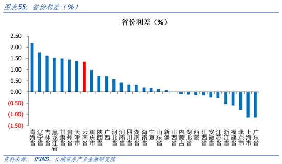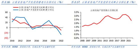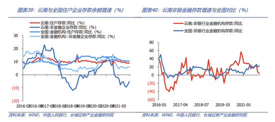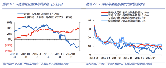 我们首先将云南省人民币净存款拆解为贷款和存款,云南省的贷款主力正在从住户贷款过渡到企业贷款,但与全国相比,企业贷款需求也较弱。我们再将贷款拆解为企业和住户两个角度。企业端看,2016年-2017年,云南企业贷款增速高于全国,从2018年开始,云南企业贷款增速持续低于全国。住户端看,近两年受房地产收缩影响,云南居民贷款增速出现大幅下降。2022年4月,云南住户贷款首次被企业贷款增速反超,贷款拉动项正在从住户贷款转换为企业贷款。