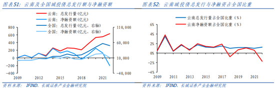 全国城投债总发行量在2009年完成三位数到四位数的跃升,达2725亿元,从此发行规模增速不断升高,2022年全国城投债总发行量达50458.81亿元,2009-2022年云南总发行量年均增长率达29.31%。云南省城投债总发行量从2009年的8亿元上涨到2022年的633.77亿元,年均复合增长率(39.98%)高于全国。云南省城投债净融资额变化趋势与全国大体相近,2016-2018年出现下滑趋势,此后开始逐步回升,2020年后再次降低。与总发行量不同的是净融资额占全国比重出现较大波动,在2018年和2022年出现明显下降。