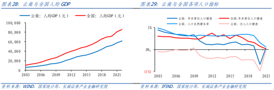云南人均产出与全国平均水平差距较大,人口持续迁出。2003-2021年云南人均GDP持续低于全国水平,趋势上差距逐渐增大。2022年云南人均GDP为61716元,远低于全国的85698元。在同年全国省市人均GDP排名中,云南居于中下游水平。