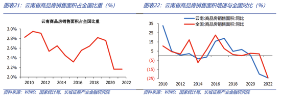 房地产投资方面,近十年云南房地产完成额增速总体呈下降趋势,2015年和2022年降幅明显。2010-2020年云南房地产开发投资增速整体高于全国,尤其是2011-2014年和2018-2019年最为明显。从公布的数据显示,在2020年新冠疫情爆发和房地产调控政策实施的时间点之后,云南省投资降速快于全国。受此影响,2010-2020年云南市房地产开发投资完成额占全国比重整体呈上升趋势,2020占比达到最高,为3.19%,之后不断下降。