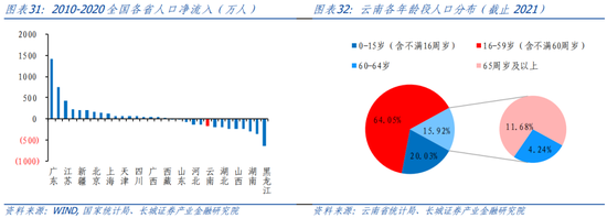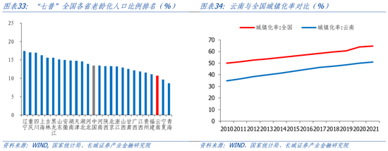 从人口结构来看,云南人口老龄化程度较轻。根据云南省2022国民经济统计公报,65岁以上人口占比为11.68%,低于全国水平(14.9%)。我们用第七次人口普查结果为全国各省市进行排名,在31各省市中,云南居于末尾,老龄化程度较轻。但根据云南政府“七普”发布会,60岁和65岁以上的比例较六普有了一定程度的提升,老龄化问题有所加剧。为此云南政府扎实推进老年健康促进行动,健全以基层医疗卫生机构为基础,完善以医疗卫生机构,深入推进医养结合。2022年8月,云南省人民政府印发的《“十四五”老龄事业发展和养老服务体系规划》中提到,随着社会保障水平逐步提高,基本养老保险法定人员参保率达到90%;养老服务体系逐渐完善,2016-2020年间,全省建设养老机构1168个,基本实现每个县、市、区建有一个县级失能特困供养服务机构。