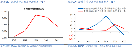 云南省出口潜力巨大。根据中国海关的数据统计,从进出口增速来看,2018-2022进出口总额保持增势,其中2018年增速最快,同比达到24.68%。2022年进出口总值达3342.3亿元人民币,同比上升6.3%。究其原因,主要是由于,2022云南省出口总额出现逆增长,同比下降8.7%。从出口来看,2018-2020年云南省出口总额增速明显高于全国,2020年时云南省出口增速为46.4%,远高于2020全国增速4.01%,2021年之后就落到全国水平之下。云南省出口总额占全国比重持续较低,2022年云南省出口金额占全国比重为0.67%,在全国近20省市排行中,排名位居末游。