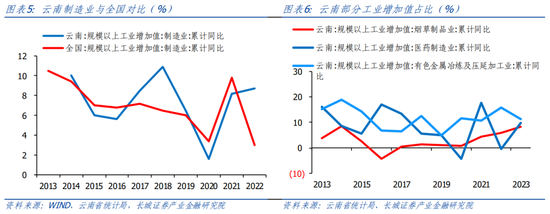 绿色能源是云南省重要支柱产业。根据云南省金融运行报告的数据显示,2021年云南省能源工业增加值同比增长11.2%。绿色能源装机绿色能源装机突破9500万千瓦,占全国比重超过85%,绿色发电量3309.9 亿度,占全国比重90%左右。云南省政府在2022年7月发布的《云南省产业强省三年行动(2022—2024年)》中提到,绿色铝,硅光伏等有色金属绿色能源产业发展快速。铝产业一直是云南的重要金属加工基地,2022年全省建成电解铝产能537 万吨,电解铝产量占全国10%,有色金属冶炼及压延加工增加值同比增长15.7%,远高于全国增速6.3%。在过去十年,有色金属冶炼及加工增加值增速基本保持在10%左右,明显高于其他两个云南省重要产业:医药制造业和烟草制品业。发改委在2021年1月发布的《西部地区鼓励类产业目录》中称,国家对云南省绿色铝、绿色硅的发展高度重视。去年云南政府工作报告也称,将加快打造云南为中国绿色铝谷、光伏之都。到2024年,全省铝合金化率达到90%左右,率先打造形成2—3个绿色低碳高端铝产业园区,绿色铝产业链产值力争达到3500亿元左右,成为国家重要的铝产业基地。
