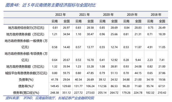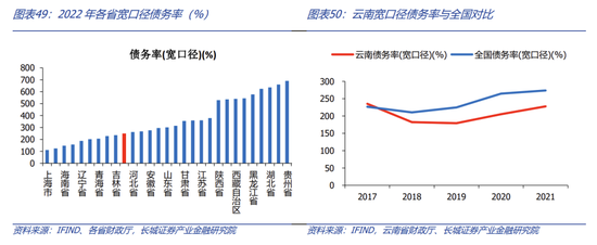 将城投债余额也纳入债务后,云南省宽口径债务率明显低于全国平均水平,且全国排名处于较低水平。云南省宽口径债务率从2017年的235.21%上升至2022年的248.38%,低于全国平均值351.12%。云南省宽口径债务率年增长为0.81%,远低于全国平均增长率4.83%,显示云南省控制地方政府隐形债务有一定成效,但依然要注意对于整体债务率的控制。