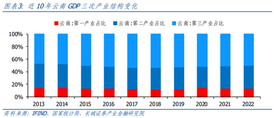 云南第一产业占比相对较高。2022年第一产业GDP为4012.20亿元,同比增长4.9%,略高于全国第一产业增速4.1%。实际上,从2010-2022增速趋势来看,云南几乎持续高于全国,多项产量名列前茅。比如2020年花卉产业综合产值830.2亿元,鲜切花产量占全国总产量的50%以上;云南核桃产量148.6万吨,是全省种植面积第一大经济作物,居全球首位;咖啡产业综合产值311.4亿元,产量13.1万吨,占全国的95%以上;2021年茶叶总产量46.6万吨,位居全国第一。还有中药材,水果,蔬菜,水产品等产品产量位居全国前列。云南省办公厅2022年7月发布的《云南省产业强省三年行动(2022—2024年)》制定三年目标:到2024年,全省粮食产量稳定在1930万吨,粮食播种面积稳定在6287万亩,农产品加工产值与农业总产值之比达到2.3以上,农林牧渔业总产值达到7500亿元,着力提高农产品市场占有率、附加值、品牌影响力、持续创新力显著增强。云南省扛牢粮食安全政治责任,牢牢守住保障国家粮食安全底线,以绿色生态为引领,以农民增收为目标,向现代农业强省迈进。