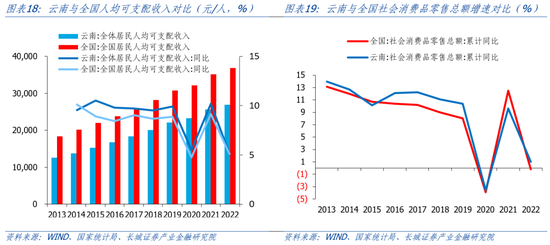 从消费方面来看,云南可支配收入稳定增长并未带动消费的快速增长。2013-2021年云南人均可支配收入相比全国水平有一定的差距,但增速基本略高全国水平。根据统计局的数据,2013-2022云南省社会消费品零售额增速和全国趋势十分相近,且占全国比重逐年上升,由2013年的1.74%逐步升至2022年的2.46%;2022年云南省社会消费品零售总额达到10838.84亿元,较上年同比下降0.2%,低于全国增速1%。