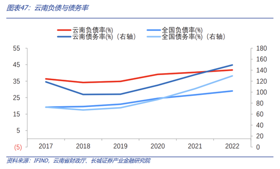 近五年云南省偿债压力上升,总体略高于全国平均水平。2022年GDP位列全国第十八位。GDP增速位居全国二十三名。云南负债率虽然在2018年有了微弱的下降,但2020年有了一定程度的提升,整体呈上升趋势,且和全国平均负债率有明显的差距。从总体偿债压力来看,2022年云南省负债率(地方政府债务余额/GDP)为41.78%,明显高于全国各省市平均水平(29.04%)。在最近五年内,云南省负债率由2017年36.38%上升至2022年41.78%,显示出云南省的负债规模较高,可见虽云南省偿债压力逐年加大,但增幅不明显。