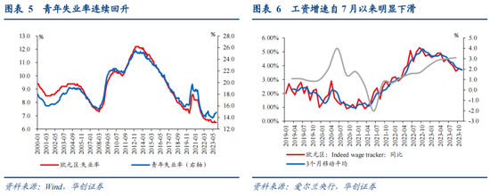 ②针对单位劳动力成本,就业市场目前已经出现边际降温迹象。一是,对经济周期活动更为敏感的青年失业率,自5月以来持续回升。二是,Indeed追踪欧元区国家线上招聘广告中的工资增速,自7月以来明显下滑。三是,衡量就业市场供需紧张程度的v/u(职位空缺率/失业率)近期出现下滑,显示就业市场供需再平衡边际改善。