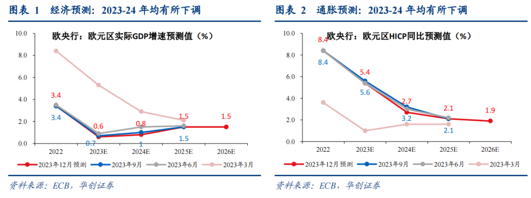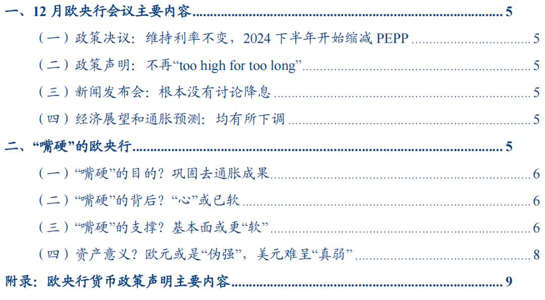 政策决议:维持三大关键利率不变;PEPP全额再投资持续至明年上半年,下半年开始缩减再投资规模,到年底完全停止再投资。利率决议方面,管委会维持主要再融资利率、隔夜贷款利率、存款便利利率分别为4.5%、4.75%、4%不变。资产购买计划方面,管委会决定将PEPP全额再投资持续至明年上半年,下半年开始,平均每月将再投资规模缩减75亿欧元,2024年底时完全停止PEPP再投资。(二)政策声明:不再“too high for too long”本次政策声明最大的变化在于,对于通胀前景的描述删掉了“预计通胀仍将too high for too long”,显示通胀去化稳步发展,也印证了欧央行“当下利率水平已经达到了足够限制性”的判断。(三)新闻发布会:根本没有讨论降息本次货币政策会议,市场最关心的就是关于降息节奏的信息,不同于美联储点阵图下移释放的鸽派信号,欧央行行长拉加德在新闻发布会上明确表示:“我们目前根本没有讨论降息”,竭力打消市场对明年3月欧央行将开启降息的预期。(四)经济展望和通胀预测:均有所下调2023-24年经济和通胀展望均较9月预测下调,显示基本面承压、偏下行。①经济预测方面,12月,欧央行对2023、2024年实际GDP增速预测分别为0.6%(9月预测为0.7%)、0.8%(9月预测为1%)。下调的原因主要是:“2023年三季度经济数据疲软且经济状况恶化。最近更多的负面结果以及出口前瞻指标显示2023-2025年净出口倾向下行。”②通胀预测方面,12月,欧央行对2023、2024年HICP同比预测分别为5.4%(9月预测值为5.6%)、2.7%(9月预测为3.2%)。下调的原因主要是能源价格意外下行。