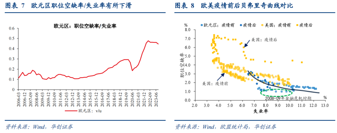 ②针对单位劳动力成本,重点即是观察就业市场的冷暖情况,目前已经出现边际降温迹象,或指向单位劳动力成本趋缓。一是对经济周期活动更为敏感的青年失业率(25岁以下人群失业率),自5月以来持续回升,或是经济活动放缓、整体失业率上行的早期信号。二是,Indeed追踪欧元区国家线上招聘广告中的工资增速,编制wage tracker指标,显示欧元区工资增速自7月以来明显下滑。三是,衡量就业市场供需紧张程度的v/u(职位空缺率/失业率)近期出现下滑,显示就业市场供需再平衡边际改善。在v/u基础上,我们进一步对比欧美就业市场的贝弗里奇曲线(关于贝弗里奇曲线的介绍,详见《贝弗里奇曲线告诉我们软着陆的可能性到底有多大?——海外论文双周志第10期》)。从数据中发现,疫情后,美国的贝弗里奇曲线似乎有所外移,即,同等失业率水平下,职位空缺率变得更高,对应v/u更大,就业市场紧张程度更高。而欧元区的贝弗里奇曲线本身似乎并未移动,只是就业市场(u,v)的点沿着疫情前的贝弗里奇曲线上移,或指向疫情后欧元区就业市场供需紧张情况的发展程度不及美国。换言之,相比于美国,欧元区的就业市场供需情况并不利于产生显著的工资压力(供给不如美国短缺、需求不及美国强韧),这可能也意味着,欧元区工资通胀的降温更快,欧元区可能是更早的降息者。
