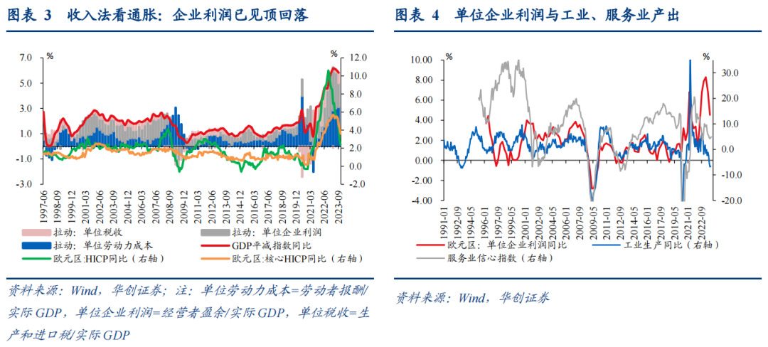 2、其次,从通胀去化进程来看,针对欧央行目前较为担忧的国内价格压力来源——企业利润和工资收入,或均将走软。