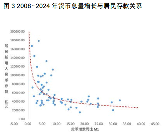 2002~2007年是中国经济高速增长阶段,中国货币总量增速配合固定资产投资规模加速提升,带动了经济活动扩张,最终提升了居民可以支配收入。然而,在2008~2024年,随着中国经济经历2008年金融危机和人口老龄化拐点,经济增长模式和经济结构开始转型,货币总量增长对居民存款的正向作用趋势性弱化。这说明以投资为主导的经济增长模式出现了边际效用递减,投资效率降低使得资金转化到居民部门的边际增速放缓,居民存款增速边际放缓。