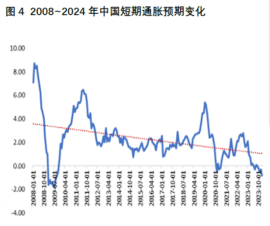 此外,需要特别注意的是欧美市场通胀环境对货币总量和居民存款之间关系的影响非常显著。类似地,通胀环境变化对中国货币总量与居民存款行为关系的影响是显著的。但不同之处是中国市场过去25年来(除2008年金融危机和2020年新冠疫情冲击)的通胀环境基本处于长期稳定的温和通胀水平(2001~2023年均值为2.16%,且通胀区间长期保持在1%~3%之间)。因此,我们认为,影响中国货币总量与居民存款行为关系的是通胀预期的状态。