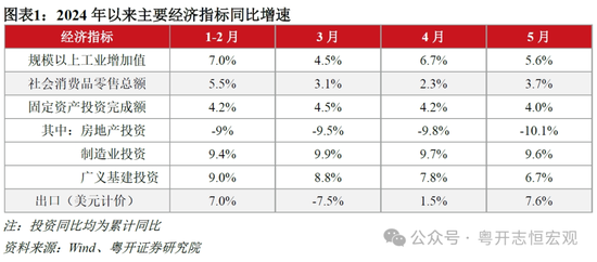 今年以来,一季度经济指标实现开门红,4月指标出现分化,5月再度分化。其中,服务业、社零消费、出口、物价数据回升;但房地产投资、销售面积累计同比降幅仍继续扩大;基建投资、制造业投资增速仍高但累计同比有所回落。