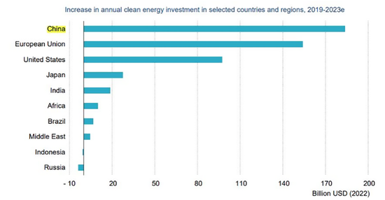 近年来(2019-2023)世界清洁能源投资变更情况,中国位列第一