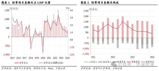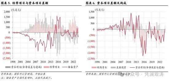2015年“8.11”汇改以来,随着汇率形成越来越市场化,央行基本退出外汇市场常态干预,稳固国际收支总体呈现经常项目顺差、资本项目(含净误差与遗漏,下同)逆差的自主平衡格局。但是,2024年一季度,在经常项目顺差的同时,资本项目也录得顺差42亿美元,这是“8.11”汇改以来首次(见图表5)。
